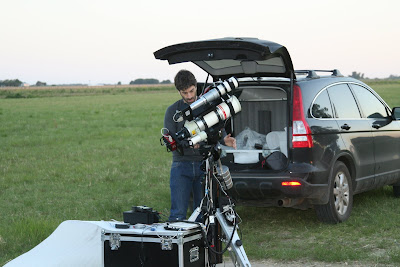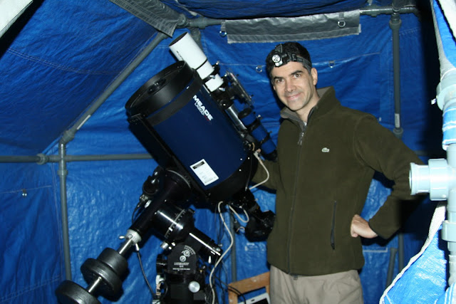 Andrés Vauttone es joven, alto, atento, y trae una carga descomunal en todo lo ha dejado libre del auto; es decir, en todo el auto, porque viene solo y sin otro equipaje que un teles Takahashi refractor que es la locura; además una Astrophysic, o algo así; una cámara SBIG y mil artilugios de brujo que de algún modo me recuerdan a ese timador que cruzaba la muralla china en los noventa, de quien por suerte no recuerdo el nombre. Era el maguito un flaco alto que anduvo por estas pampas deslumbrando giles. Andrés en nada se parece al showman, pues Vauttone es culto, amable y para nada kitsch, y ese flaco de la tele que volaba era todo lo contrario. Se me figuraba el parecido en la cantidad de equipo y de cajas que bajaba y subía de aquí para allá.