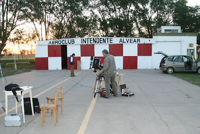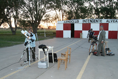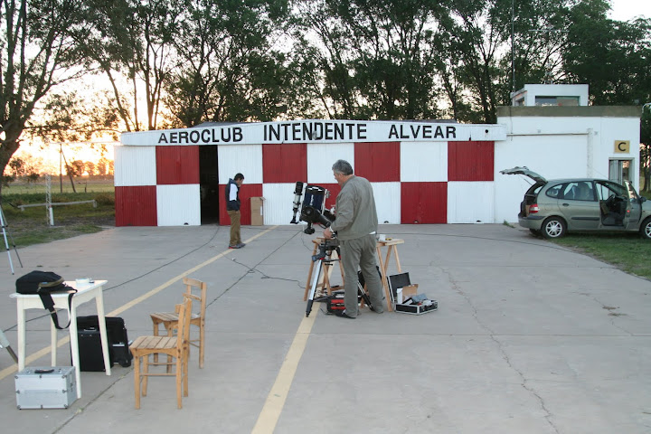 Las nubes que durante el día se habían ido juntando en el cielo y que pintaban blancas, eran ahora negras como la conciencia de un salieri y se aglutinaban en un grotesco amenazador. Leo había testeado el accuweather y no sé qué otro windguru y porfiaba No va a llover. En menos de lo que creas, esto está limpio como el espejo del Epsilon 180. Epsilon qué, si no corremos a tapar, en un instante se llena de agua, porque apenas habíamos armado las monturas y bajado los varios bultos, nos cae un fonazo de la Juli desde Alvear, diciendo en su tono bajo y medido siempre, acaso con un par de cuerpos del puzzle en la mano, dubitativa aún, Leo, mi amor, corazoncito, acá está lloviendo, tal vez te convendría tomar alguna precau… pero a esta altura del discurso, Leo había tirado el teléfono entre los motores de los aviones desarmados y corría a tapar su excelente DAP para mantener el Epsilon en condiciones de dar ejemplos de pulcritud y aplomo ante el alto cielo y los lectores. Andrés no se movía con menor rapidez y la misma Adriana recibió la ayuda del grupo para correr todo a resguardo. La montura astrophysic no es cosa de mover en dos minutos, pero somos nosotros los que estamos aquí, y no timoratos que suspenden al primer chaparrón. Así que Andrés cuenta con nutrida tela de nylon para cubrirlo todo y pronto nos aúna el techo del hangar. Se imaginarán que un tipo de mis kilates (kilajes??) no iba a andar corriendo.